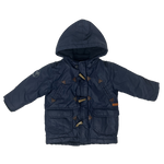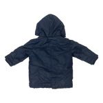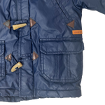 Campera azul con cierre y botones tipo parka, capucha con piel removible
