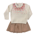 Conjunto 2 piezas, buzo tejido con lentejuelas bordadas + falda plisada con brillos.