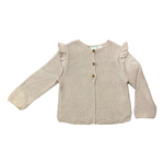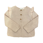 Saquito tejido rosa, abotonado, con volados en los hombros