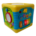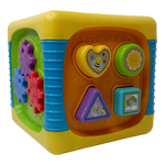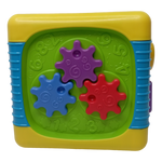 Características: Cubo de actividades múltiples con 5 teclas iluminadas y almohadilla de batería intermitente que se combina con botones de sonidos, canciones y sonidos de animales. Además, tiene con un espejo seguro, engranajes giratorios y controles deslizantes que se mueven. Cuenta con actividad de 4 formas geométricas.
